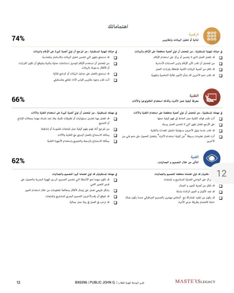 (بإمكانك تمرير الصور لمشاهدة نموذج من صفحات التقرير، مع العلم أن المعلومات والأرقام تتغير بالطبع باختلاف نتيجة التقييم)