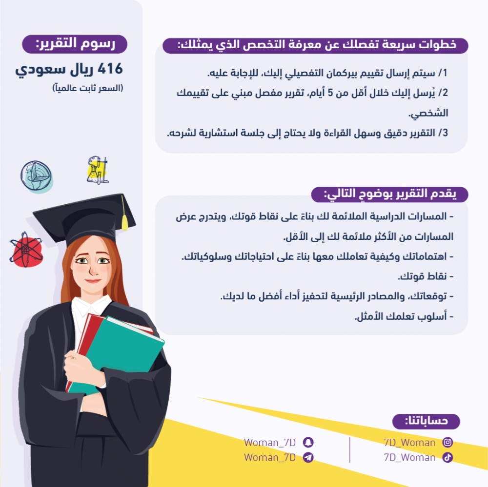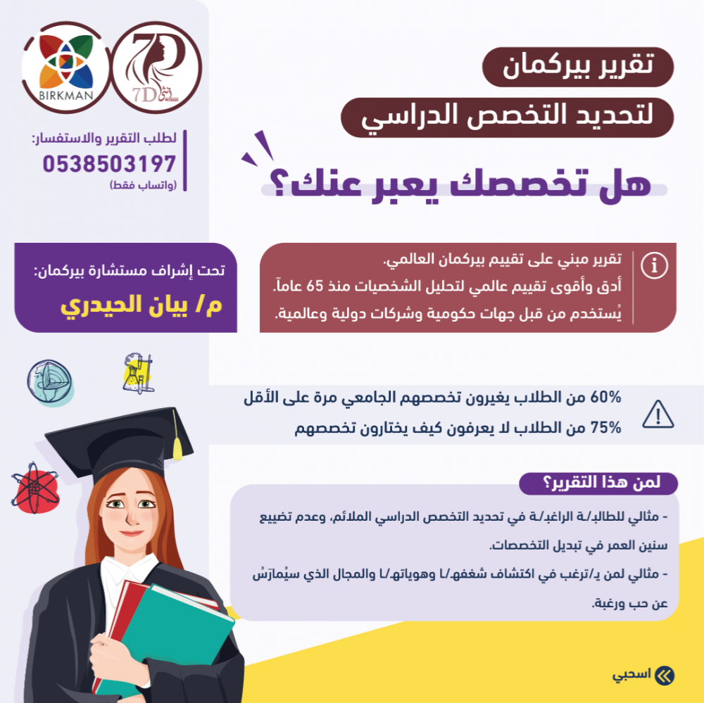 - مثالي للطالبـ/ـة الراغبـ/ـة في تحديد التخصص الدراسي الملائم، وعدم تضييع سنين العمر في تبديل التخصصات.
