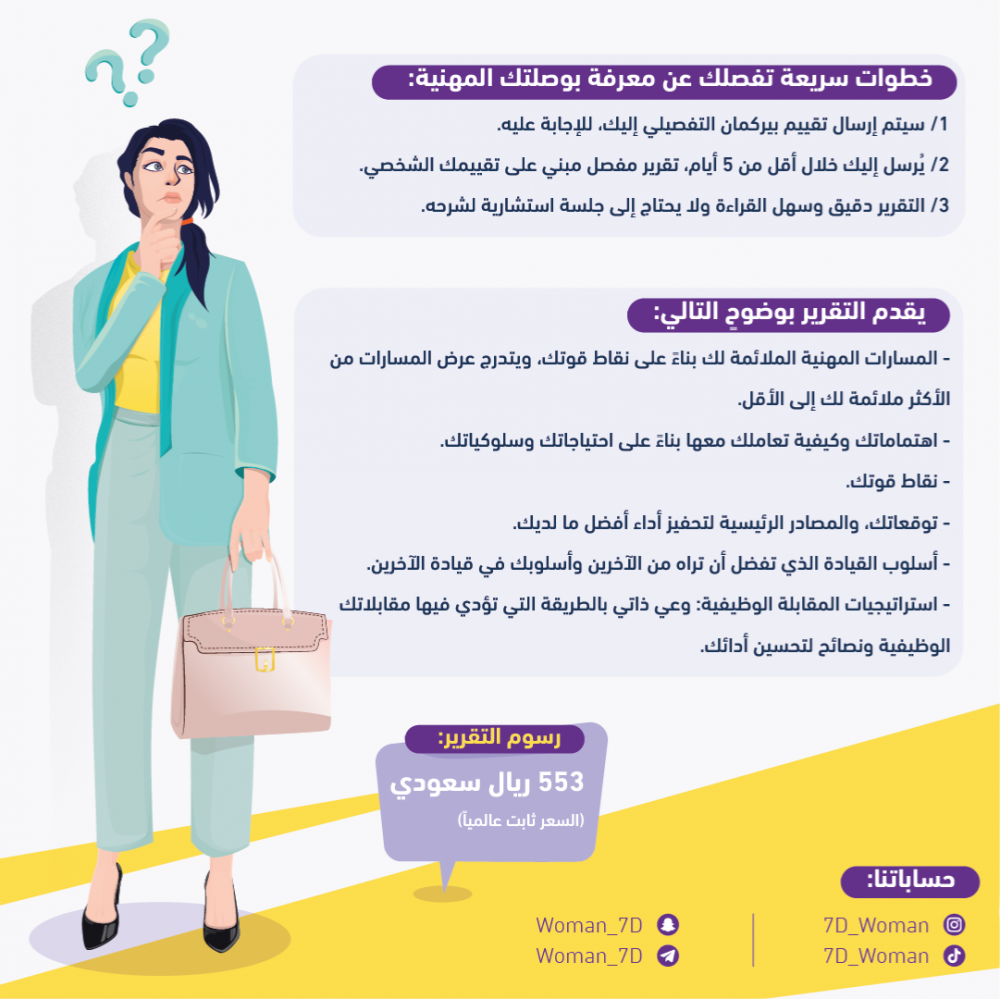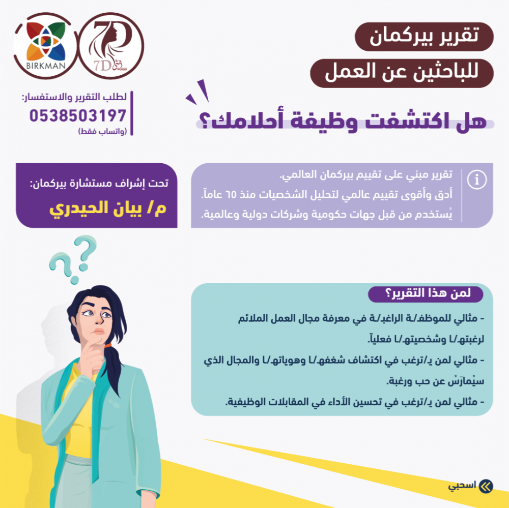 - مثالي للموظفـ/ـة الراغبـ/ـة في معرفة مجال العمل الملائم لرغبتهـ/ـا وشخصيتهـ/ـا فعلياً.